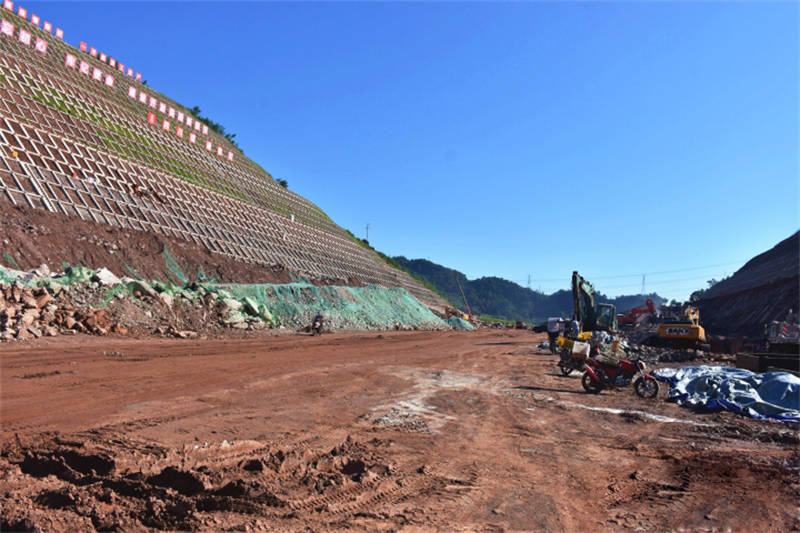 在金雞關(guān)開挖現(xiàn)場,貨車往來運(yùn)輸著物料,挖掘機(jī)、吊車等各司其職,在機(jī)械和車輛碾壓下,土路基已較為平坦,道路初具雛形。