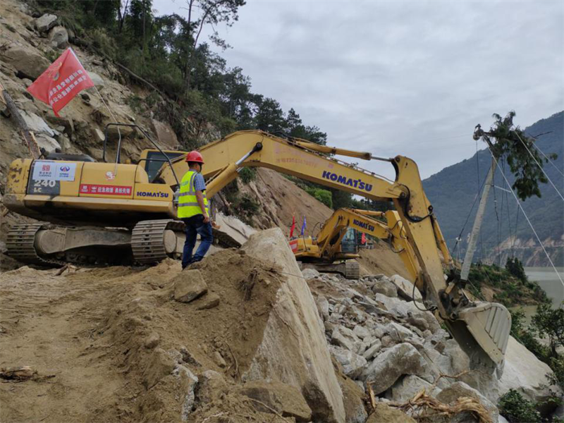 搶險隊伍,馬上出發(fā)!集團領(lǐng)導(dǎo)班子立即召開碰頭會,分析研判形勢,安排部署工作,密切關(guān)注震區(qū)態(tài)勢,成立抗震救災(zāi)領(lǐng)導(dǎo)小組,副總經(jīng)理鐘焱宇率現(xiàn)場指揮組趕赴石棉靠前指揮搶險救災(zāi)。正在石棉G108線施工的康藏路橋公司項目部組成10人搶險救援小分隊,攜帶挖掘機4臺、拖車4臺、裝載機3臺、交通運輸車2輛、無人機1臺,第一時間到就地搶險工作,震后7小時,完成國道G108線馬富至菩薩崗約40公里路段、6處塌方點1600余方土石方清理,爾后轉(zhuǎn)戰(zhàn)石棉縣新民鄉(xiāng)進行通鄉(xiāng)道路搶通作業(yè)。