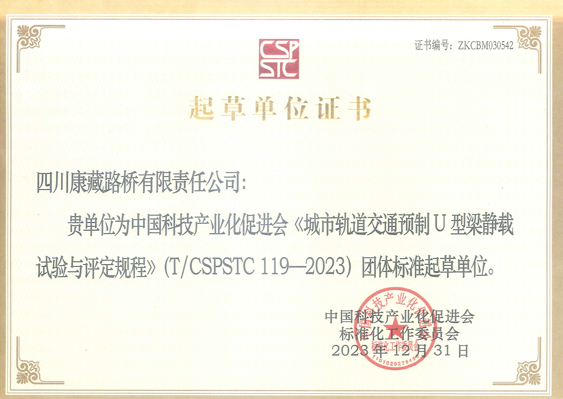 日前,雅安市交通建設(shè)(集團(tuán))有限責(zé)任公司收到中國科技產(chǎn)業(yè)化促進(jìn)會頒發(fā)的《城市軌道交通預(yù)制U型梁靜載試驗(yàn)與評定規(guī)程》(T/CSPSTC119-2023)團(tuán)體標(biāo)準(zhǔn)起草單位證書,路橋公司參與起草的《城市軌道交通預(yù)制U型梁靜載試驗(yàn)與評定規(guī)程》團(tuán)體標(biāo)準(zhǔn),于2023年12月31日正式發(fā)布實(shí)施。