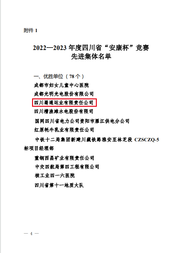 日前,省總工會、省應急管理廳、省衛(wèi)健委聯(lián)合發(fā)文表揚2022-2023年度四川省“安康杯”競賽先進集體和先進個人,蜀通公司被評為“優(yōu)勝單位”。