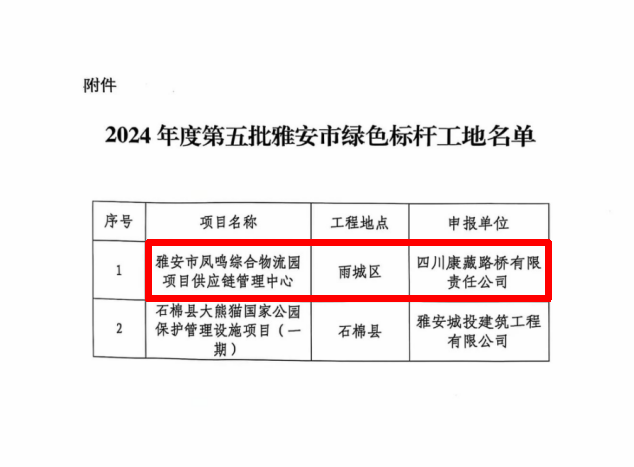 近日,由雅安交建集團康藏路橋公司建設的鳳鳴綜合物流園項目供應鏈管理中心,經市住建局、市生態(tài)環(huán)境局、市城管執(zhí)法局聯(lián)合評審小組綜合考評,被評為雅安市綠色標桿工地。