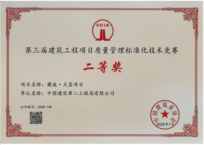 近日,交建開發(fā)公司旗下“蘭庭・天璽”項目在中國建筑業(yè)協(xié)會組織的“第三屆建筑工程項目質(zhì)量管理標(biāo)準(zhǔn)化技術(shù)競賽”中榮獲二等獎。此次獲獎,標(biāo)志著“蘭庭・天璽”項目的質(zhì)量管理體系與工程實體質(zhì)量獲得了行業(yè)權(quán)威認(rèn)可,為項目后續(xù)創(chuàng)建更高層次的品質(zhì)獎項積累了寶貴經(jīng)驗。