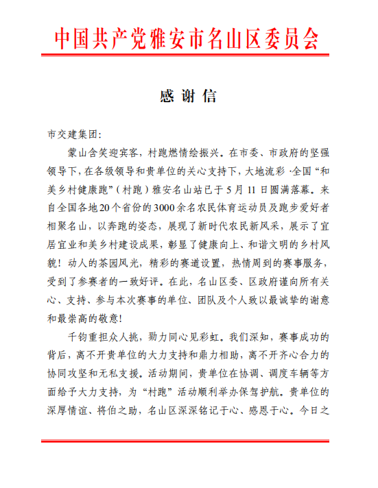 5月10日至11日,以“心向和美 逐夢茶源”為主題的大地流彩·2025年全國和美鄉(xiāng)村健康跑(村跑)雅安名山站活動在雅安市名山區(qū)成功舉辦。四川蜀通運(yùn)業(yè)有限責(zé)任公司作為運(yùn)輸保障單位,圓滿完成賽事期間各項(xiàng)運(yùn)輸保障任務(wù),為活動的順利開展提供了堅(jiān)實(shí)保障,受到名山區(qū)委、區(qū)政府感謝信。