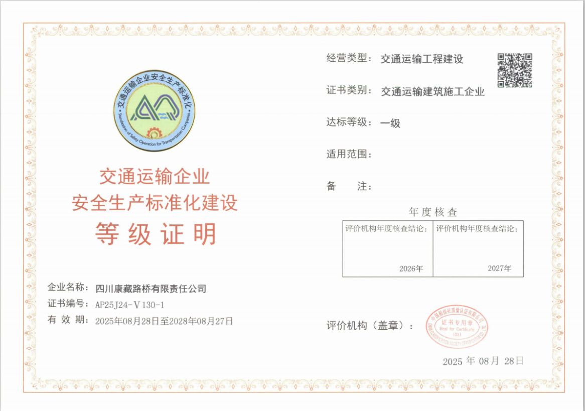 近日,經(jīng)交通運(yùn)輸部交通運(yùn)輸企業(yè)安全生產(chǎn)標(biāo)準(zhǔn)化評價機(jī)構(gòu)綜合評定,康藏路橋公司獲評安全標(biāo)準(zhǔn)化一級企業(yè)并取得證書,標(biāo)志其安全生產(chǎn)管理體系獲國家最高標(biāo)準(zhǔn)認(rèn)可。