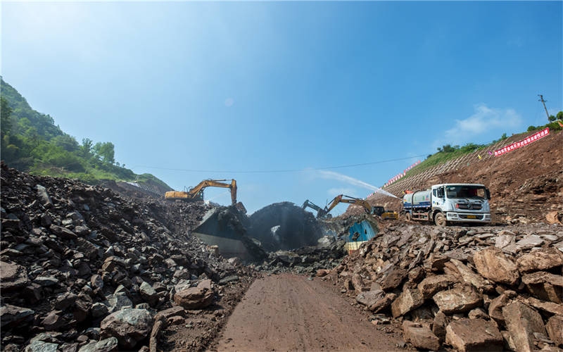 上午10點(diǎn),金雞關(guān)隧道開挖現(xiàn)場,多臺大型破碎機(jī)和灑水除塵設(shè)備同時按下啟動鍵,建設(shè)的“沖鋒號”奏響。金雞關(guān)隧道開挖是整個項(xiàng)目取得突破性進(jìn)展的標(biāo)志,是路基鋪設(shè)和邊坡抗滑裝等施工開展的基礎(chǔ)。目前土方開挖已完成365萬方,邊坡施工已完成8級,項(xiàng)目整體推進(jìn)有序,預(yù)計(jì)兩個月完成隧道部分開挖。