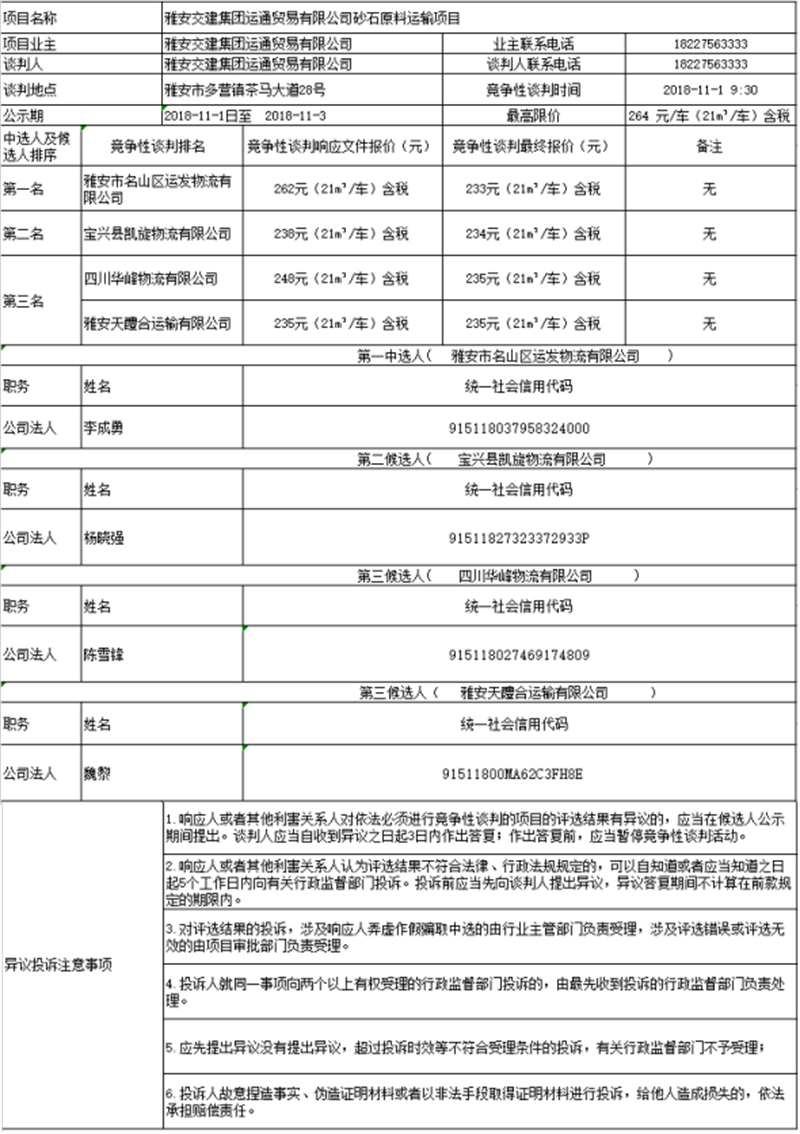 雅安交建集團(tuán)運通貿(mào)易有限公司砂石原料運輸項目競爭性談判中選人及候選人公示