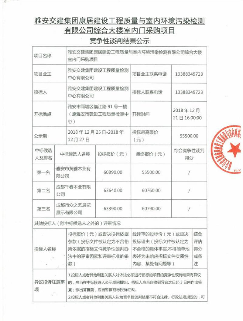 綜合大樓室內門采購項目競爭性談判結果公示