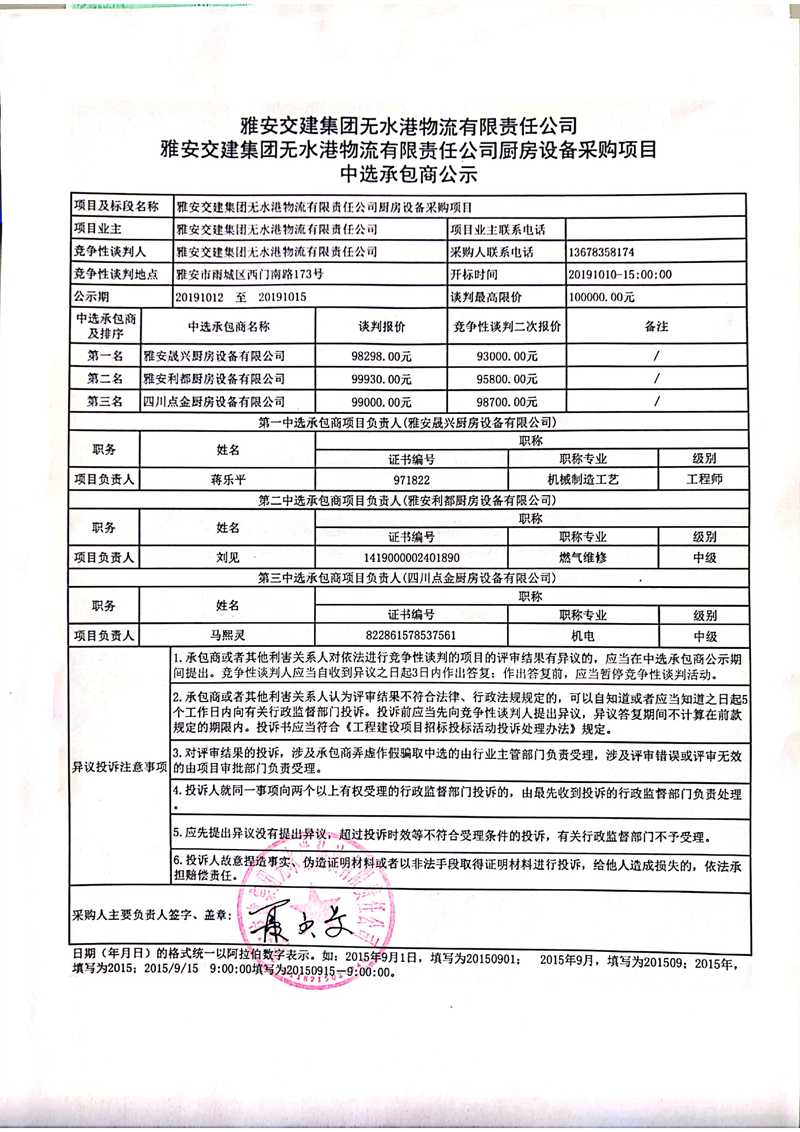 雅安交建集團無水港物流有限責任公司廚房設(shè)備采購項目中選承包商公示