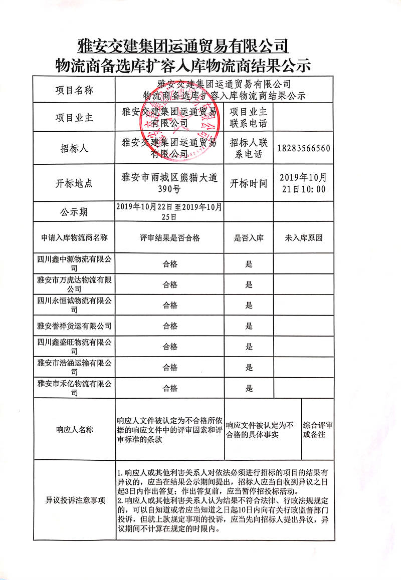 雅安交建集團(tuán)運(yùn)通貿(mào)易有限公司物流商備選庫(kù)擴(kuò)容入庫(kù)物流商結(jié)果公示