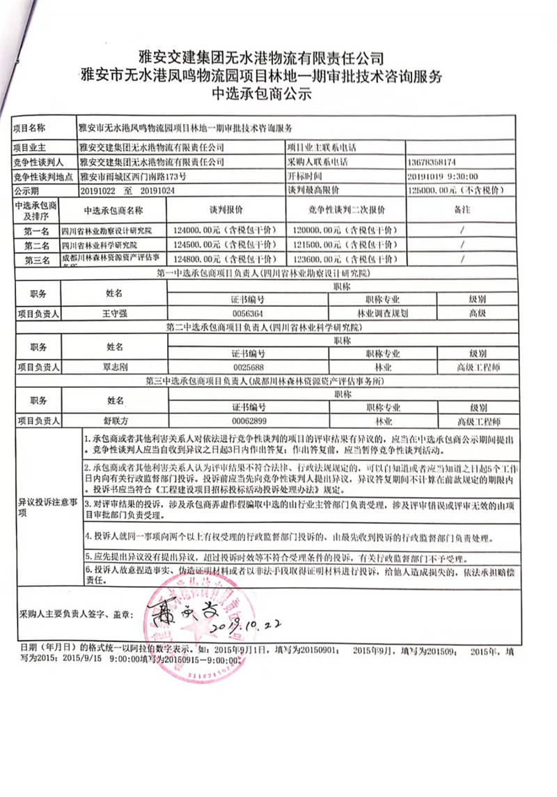 雅安交建集團無水港物流有限責任公司雅安市無水港鳳鳴物流園項目林地一期審批技術咨詢服務中選承包商公示