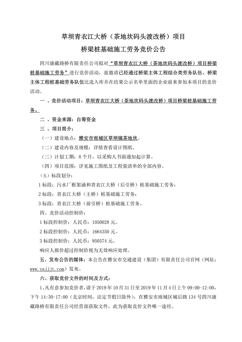 四川康藏路橋有限責任公司草壩青衣江大橋(茶地坎碼頭渡改橋)項目橋梁樁基礎施工勞務競價公告