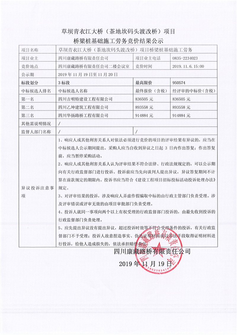 四川康藏路橋有限責(zé)任公司草壩青衣江大橋(茶地坎碼頭渡改橋)項(xiàng)目橋梁樁基礎(chǔ)施工勞務(wù)競(jìng)價(jià)(3標(biāo)段)結(jié)果公示