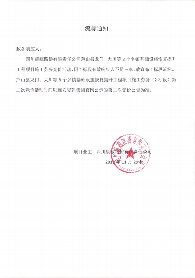 四川康藏路橋有限責(zé)任公司蘆山縣龍門、大川等8個鄉(xiāng)鎮(zhèn)基礎(chǔ)設(shè)施恢復(fù)提升工程項目施工勞務(wù)(2標(biāo)段)競價流標(biāo)通知