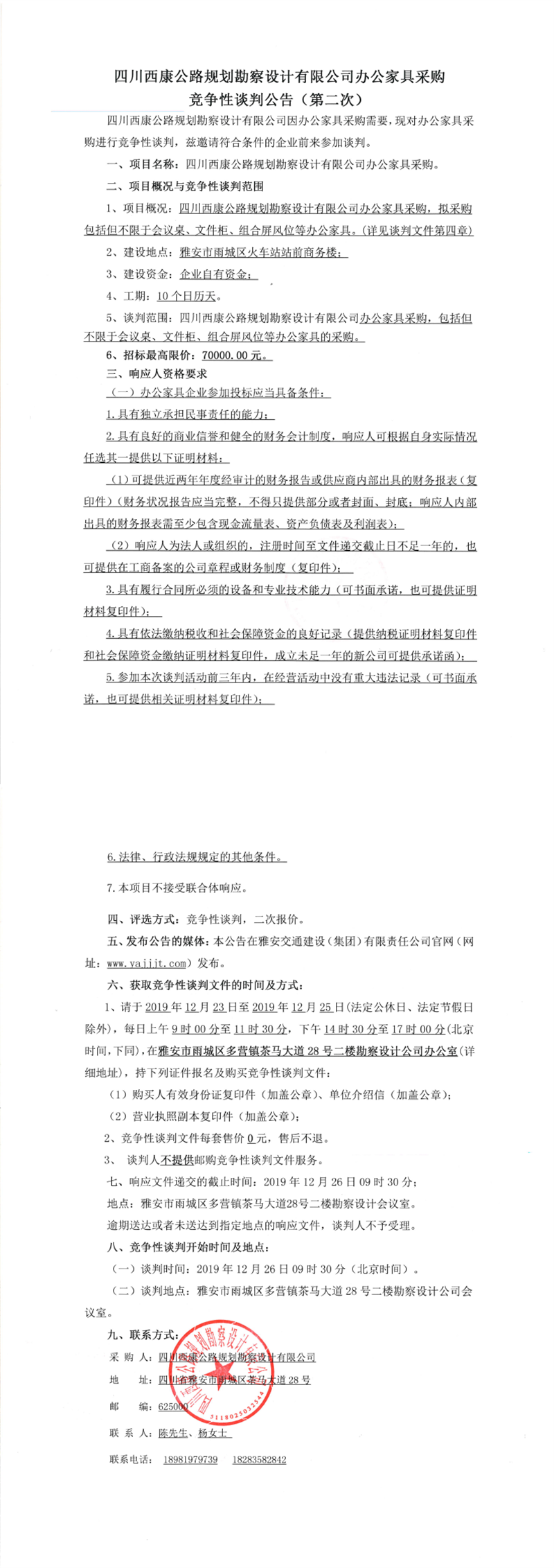 四川西康公路規(guī)劃勘察設(shè)計(jì)有限公司辦公家具采購競(jìng)爭性談判公告(第二次)