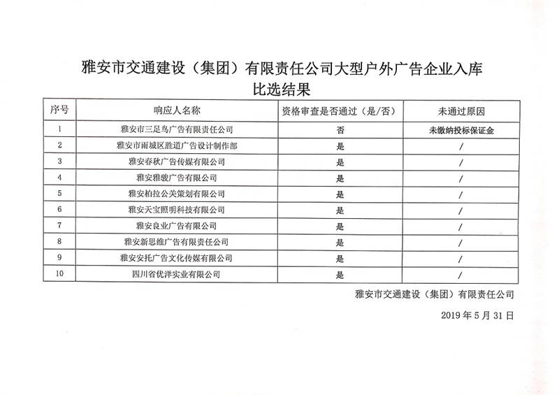 雅安市交通建設(shè)(集團)有限責(zé)任公司大型戶外廣告企業(yè)入庫比選結(jié)果