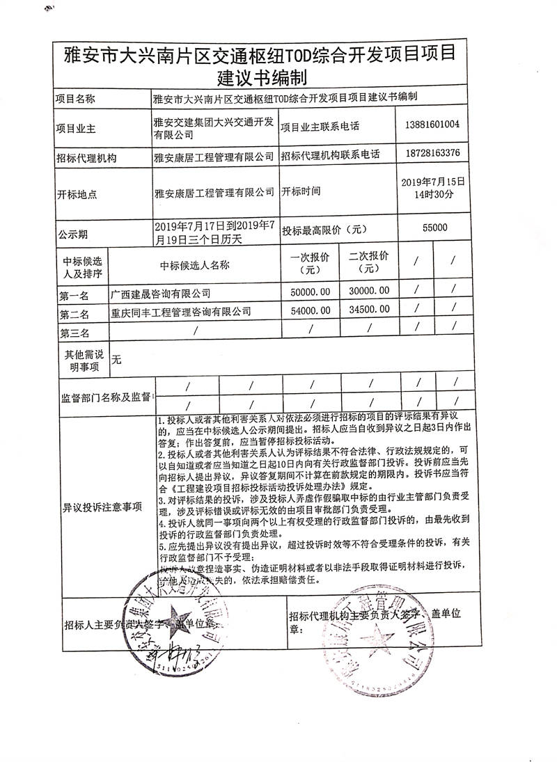 雅安交建集團大興交通開發(fā)有限公司雅安市大興南片區(qū)交通樞紐TOD綜合開發(fā)項目項目建議書編制競爭性談判結(jié)果公示
