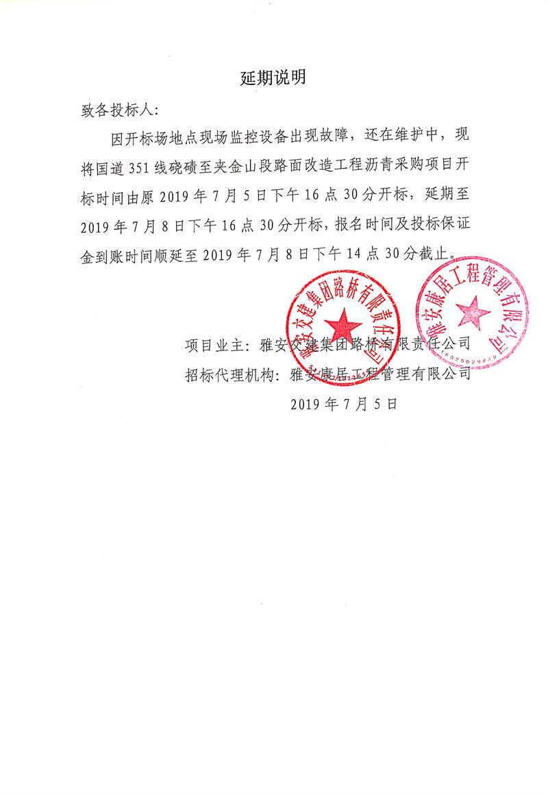 雅安交建集團(tuán)路橋有限責(zé)任公司國(guó)道351線磽磧至夾金山段路面改造工程瀝青采購(gòu)招標(biāo)延期說(shuō)明