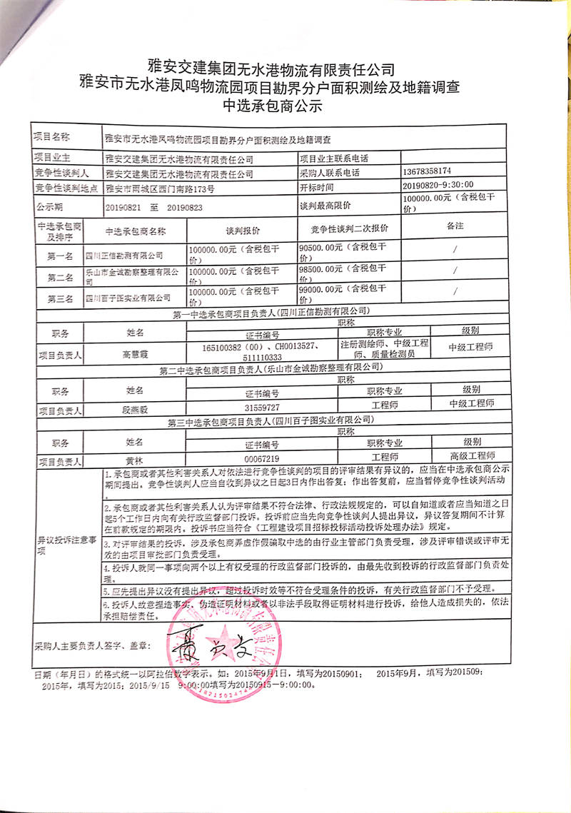 雅安交建集團(tuán)無(wú)水港物流有限責(zé)任公司雅安市無(wú)水港鳳鳴物流園項(xiàng)目勘界分戶面積測(cè)繪及地籍調(diào)查中選承包商公示