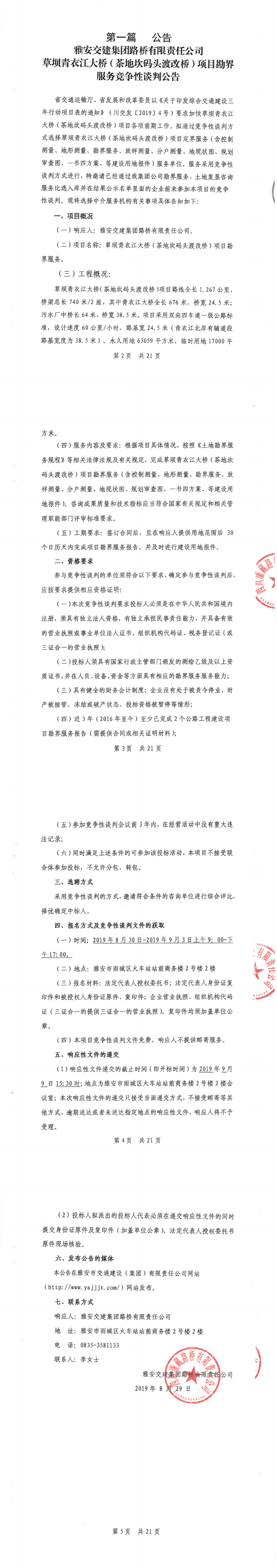 雅安交建集團路橋有限責任公司草壩青衣江大橋(茶地坎碼頭渡改橋)項目勘界服務競爭性談判公告