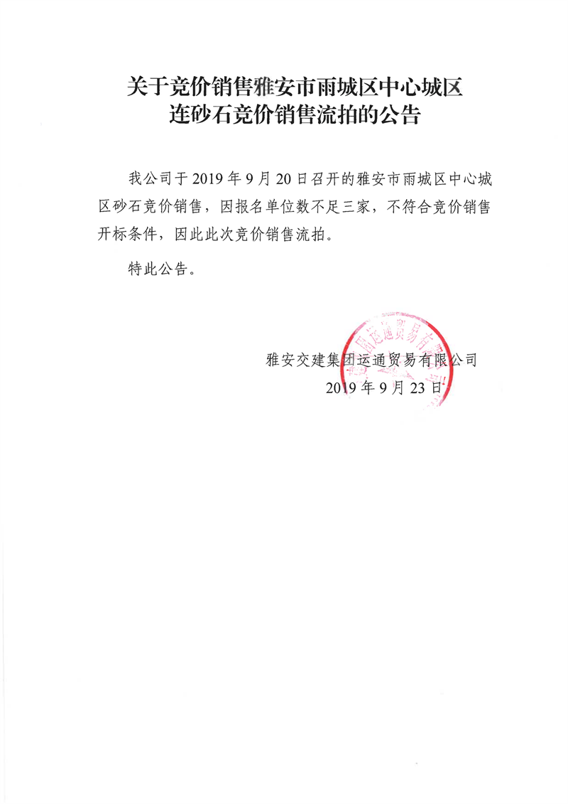 雅安交建集團(tuán)運(yùn)通貿(mào)易有限公司關(guān)于競價(jià)銷售雅安市雨城區(qū)中心城區(qū)連砂石競價(jià)銷售流拍的公告