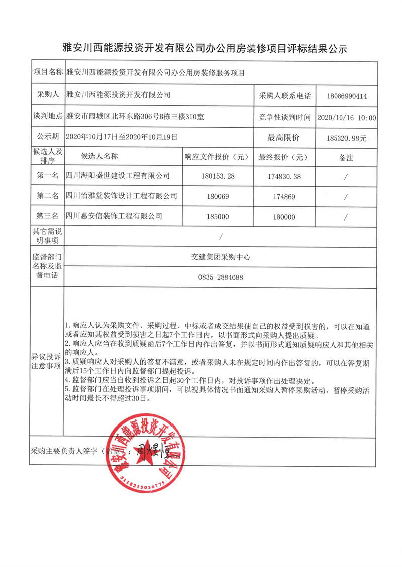 雅安川西能源投資開發(fā)有限公司辦公用房裝修項目評標結果公示
