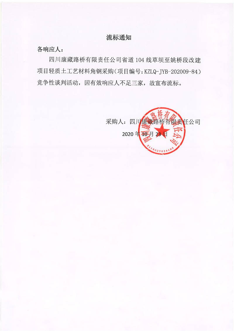 四川康藏路橋有限責(zé)任公司省道104線草壩至姚橋段改建項目輕質(zhì)土工藝材角鋼采購項目流標(biāo)通知