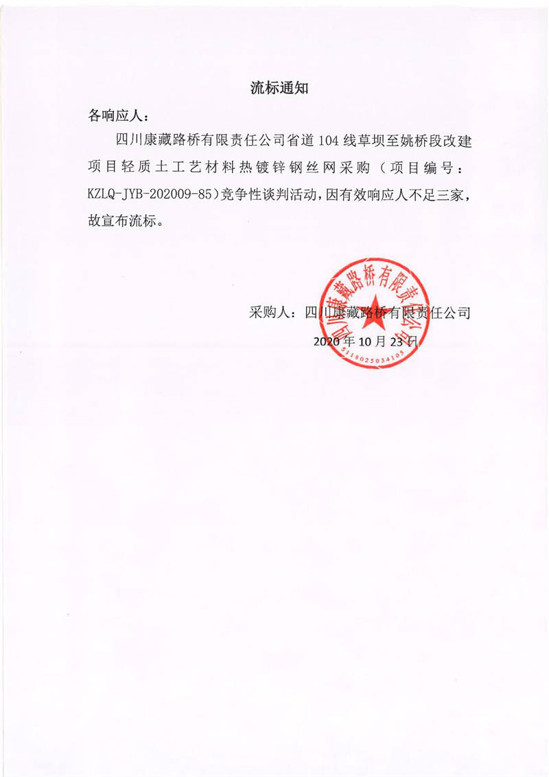四川康藏路橋有限責任公司省道104線草壩至姚橋段改建項目輕質(zhì)土工藝材料熱鍍鋅鋼絲網(wǎng)采購項目流標通知