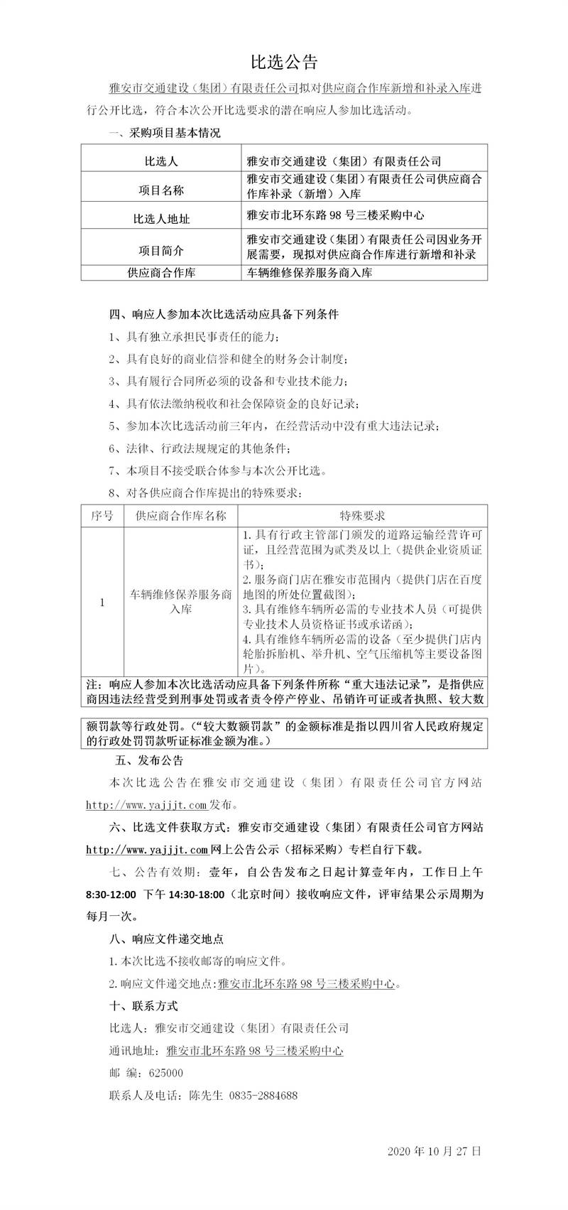 雅安市交通建設(shè)(集團(tuán))有限責(zé)任公司供應(yīng)商合作庫(kù)補(bǔ)錄(新增)入庫(kù)比選公告