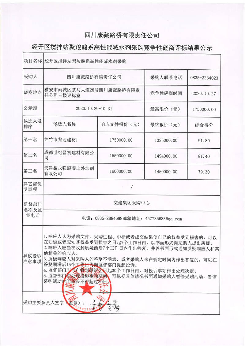 四川康藏路橋有限責(zé)任公司經(jīng)開區(qū)攪攔站聚羧酸系高性能減水劑采購競爭性磋商評(píng)標(biāo)結(jié)果公示