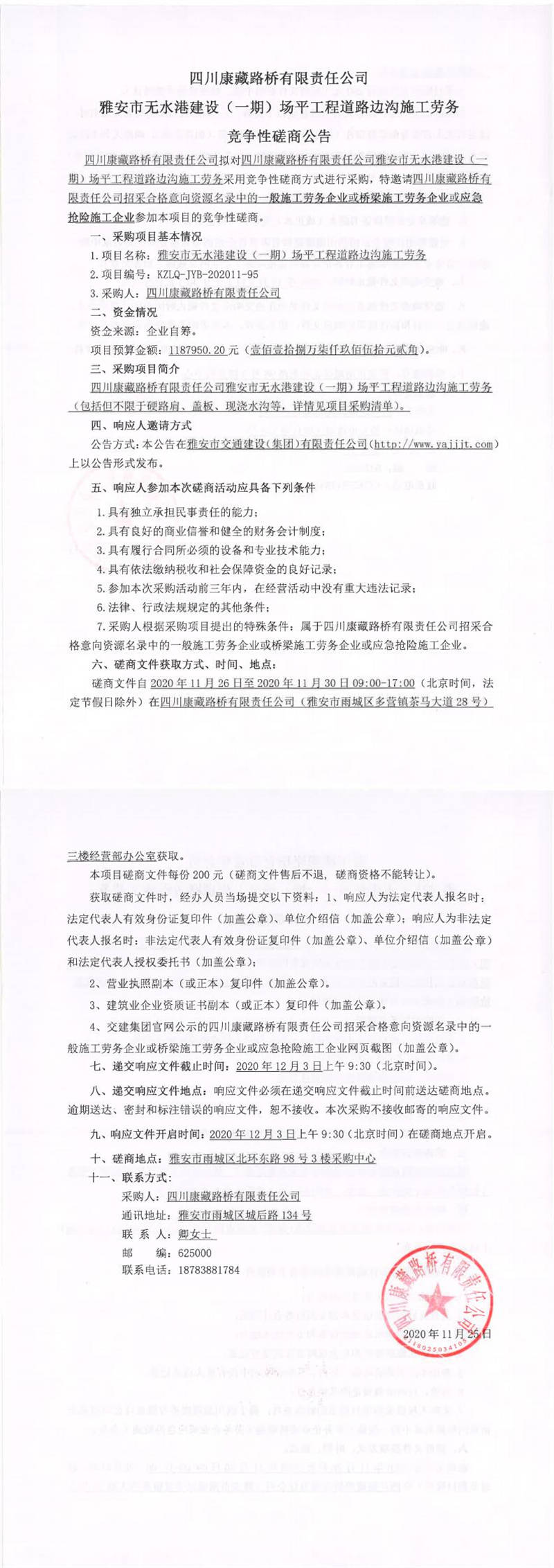四川康藏路橋有限責(zé)任公司雅安市無(wú)水港建設(shè)(一期)場(chǎng)平工程道路邊溝施工勞務(wù)競(jìng)爭(zhēng)性磋商公告
