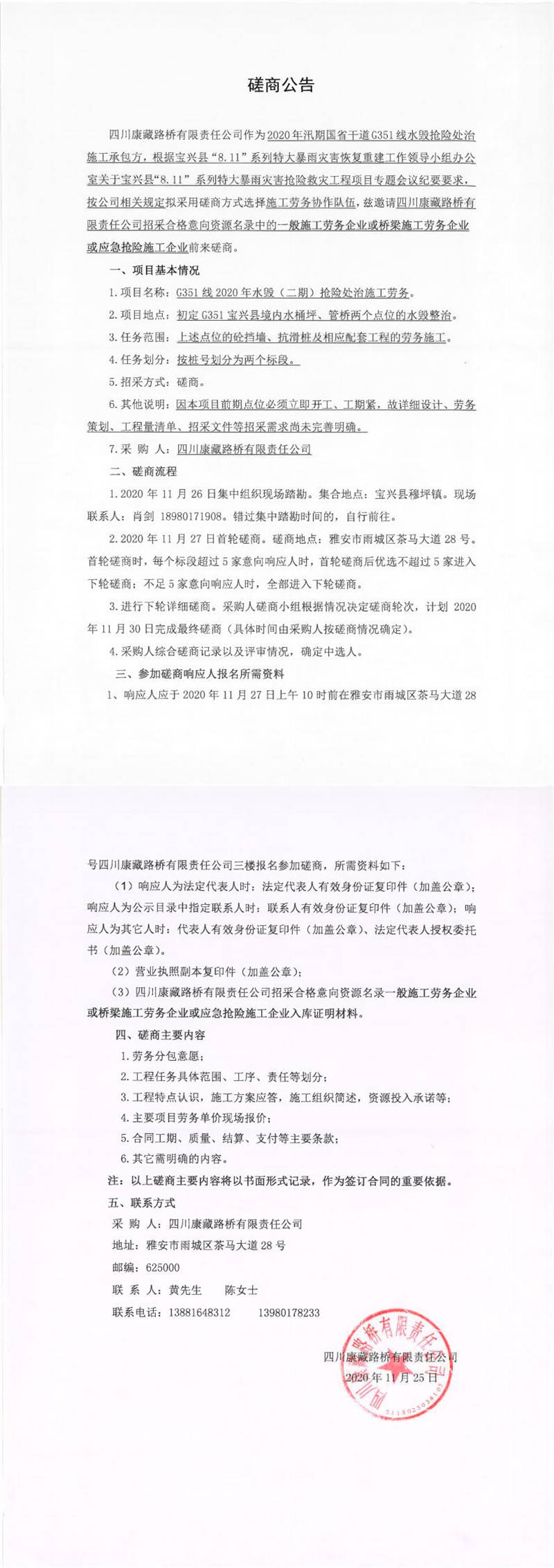 四川康藏路橋有限責(zé)任公司G351線(xiàn)2020年水毀(二期)搶險(xiǎn)處治施工勞務(wù)磋商公告