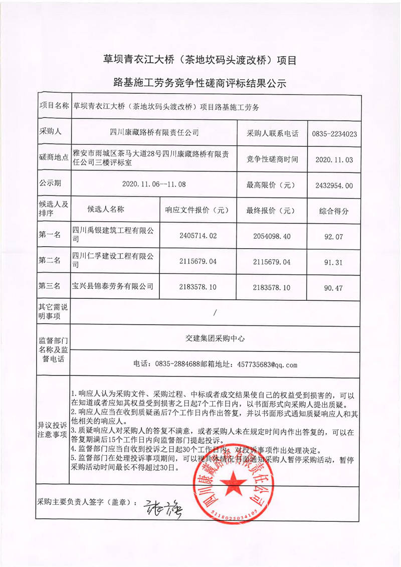 四川康藏路橋有限責(zé)任公司草壩青衣江大橋(茶地坎碼頭渡改橋)項(xiàng)目路基施工勞務(wù)競爭性磋商評標(biāo)結(jié)果公示