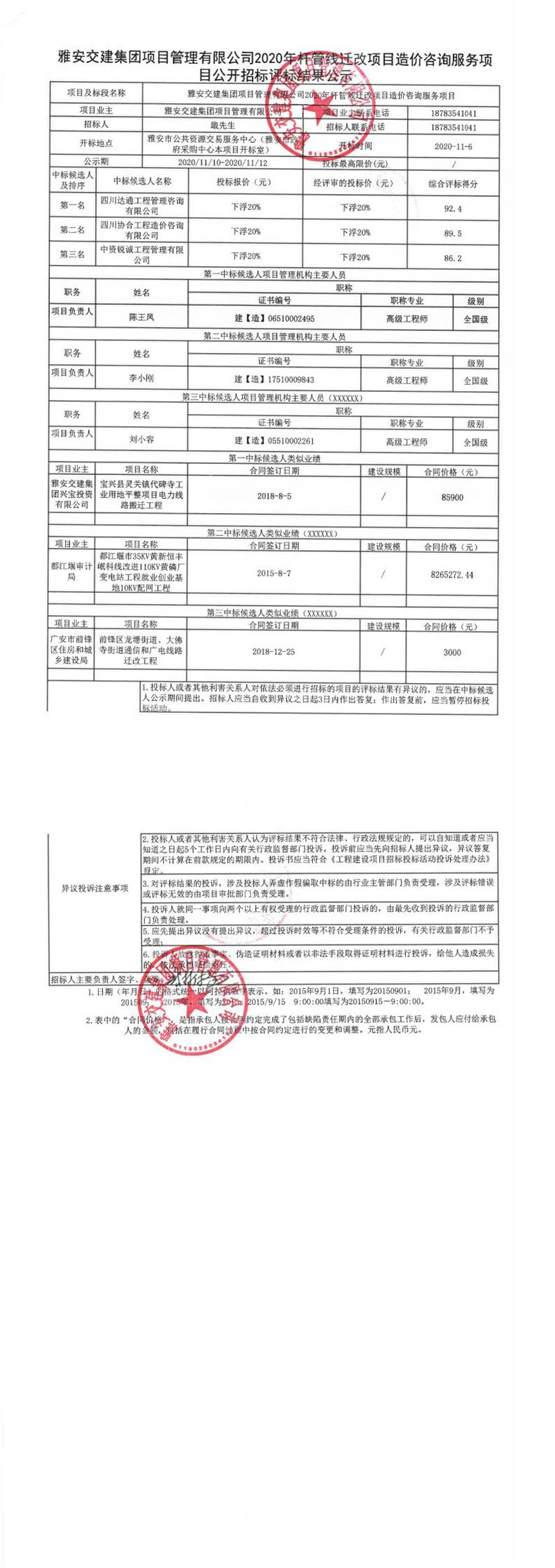 雅安交建集團項目管理有限公司2020年桿管線遷改項目造價咨詢服務(wù)項目公開招標(biāo)評標(biāo)結(jié)果公示