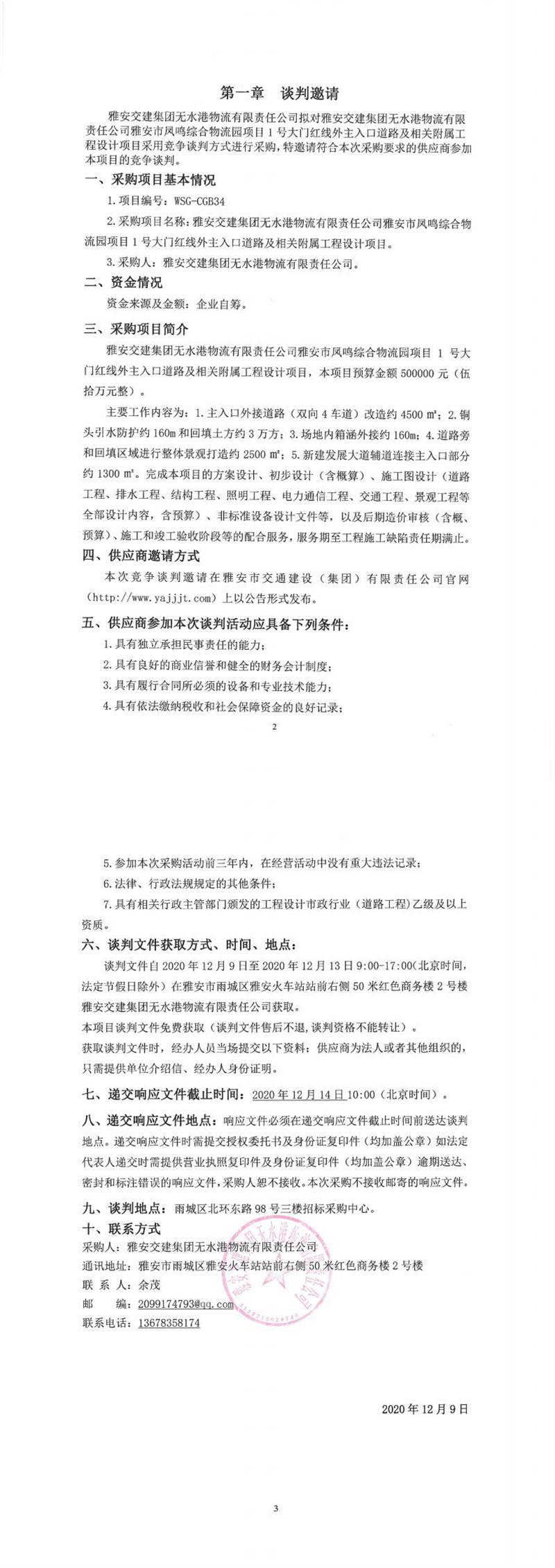 雅安交建集團(tuán)無(wú)水港物流有限責(zé)任公司雅安市鳳鳴綜合物流園項(xiàng)目1號(hào)大門紅線外主入口道路及相關(guān)附屬工程設(shè)計(jì)項(xiàng)目競(jìng)爭(zhēng)談判公告