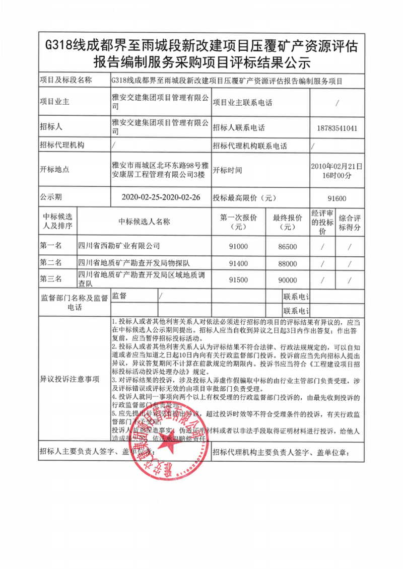 雅安交建集團項目管理有限公司G318線成都界至雨城段新改建項目壓覆礦產(chǎn)資源評估報告編制服務(wù)采購項目評標(biāo)結(jié)果公示