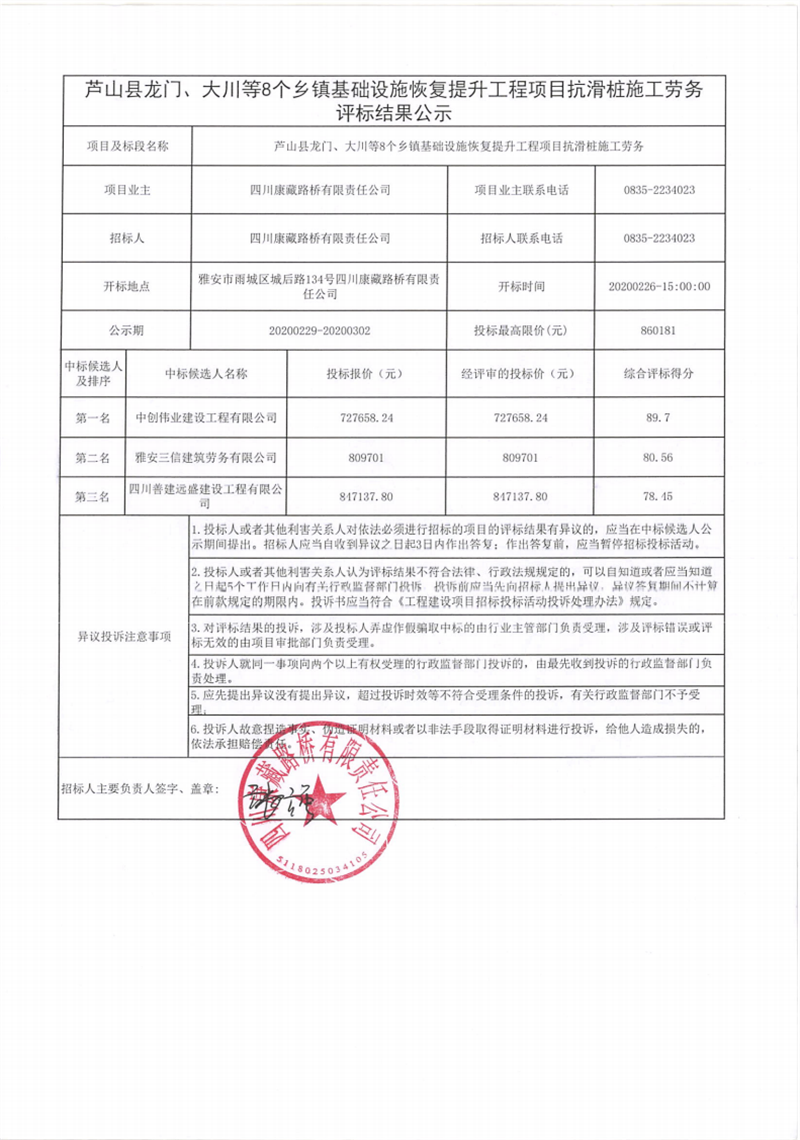 四川康藏路橋有限責(zé)任公司蘆山縣龍門、大川等8個(gè)鄉(xiāng)鎮(zhèn)基礎(chǔ)設(shè)施恢復(fù)提升工程項(xiàng)目抗滑樁施工勞務(wù)評(píng)標(biāo)結(jié)果公示