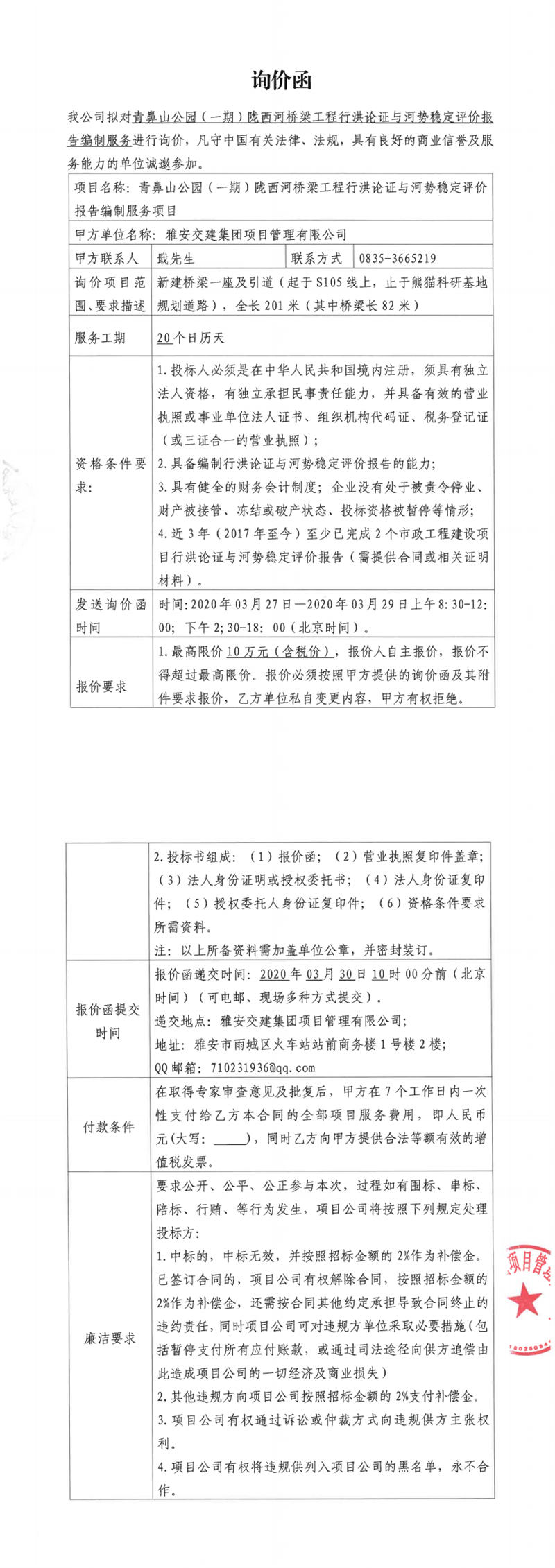 雅安交建集團(tuán)項目管理有限公司青鼻山公園(一期)隴西河橋梁工程行洪論證及河勢穩(wěn)定評價報告編制服務(wù)項目詢價函