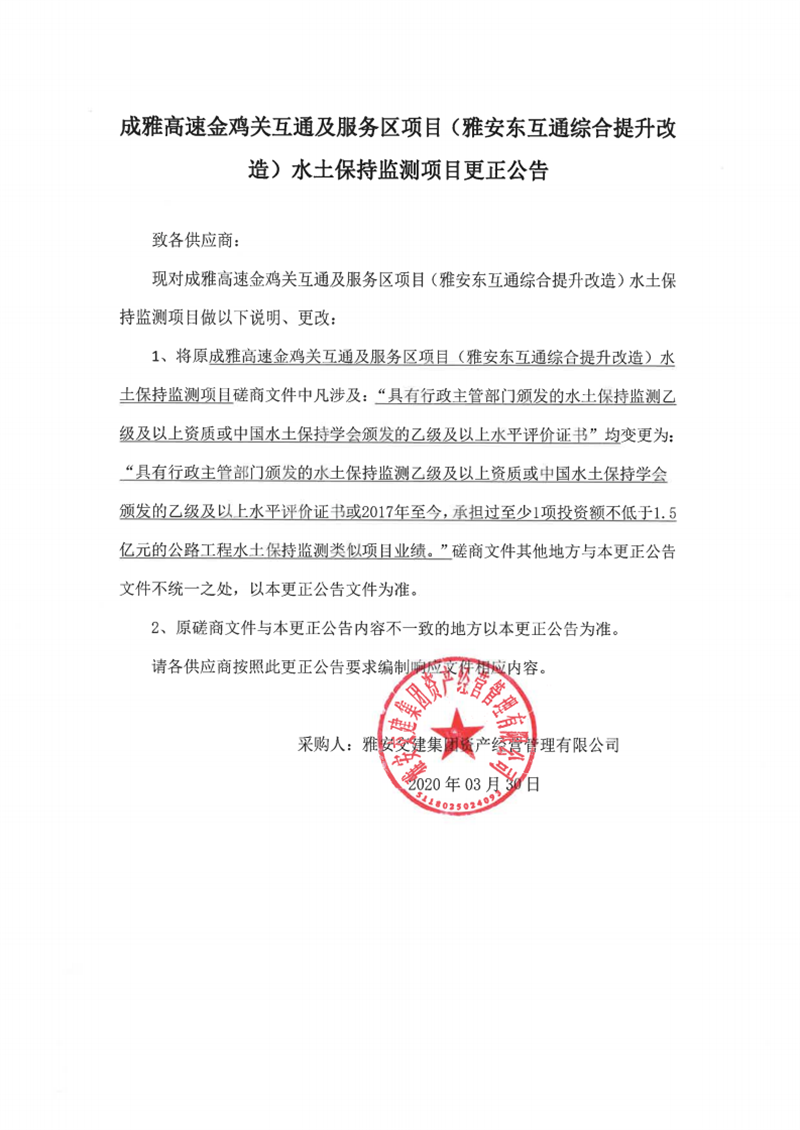 雅安交建集團(tuán)資產(chǎn)經(jīng)營管理有限公司成雅高速金雞關(guān)互通及服務(wù)區(qū)項目(雅安東互通綜合提升改造)水土保持監(jiān)測項目更正公告