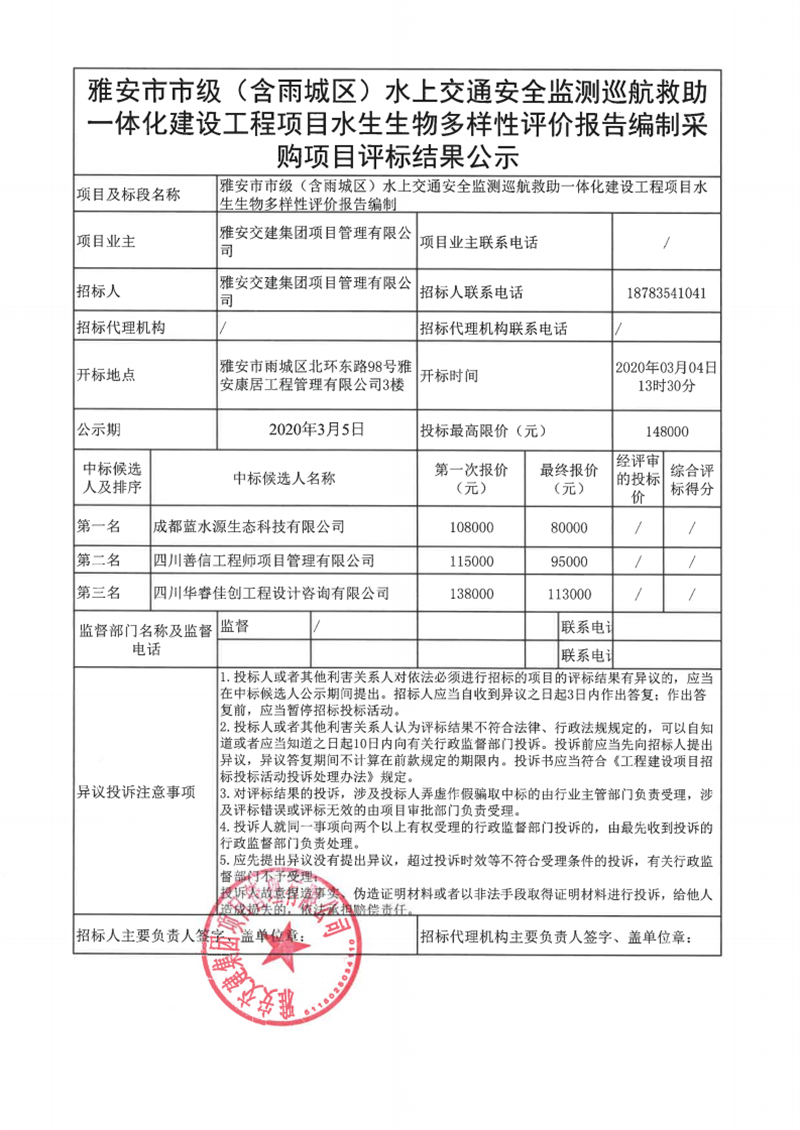 雅安交建集團(tuán)項目管理有限公司雅安市市級(含雨城區(qū))水上交通安全監(jiān)測巡航救助一體化建設(shè)工程項目水生生物多樣性評價報告編制采購項目評標(biāo)結(jié)果公示