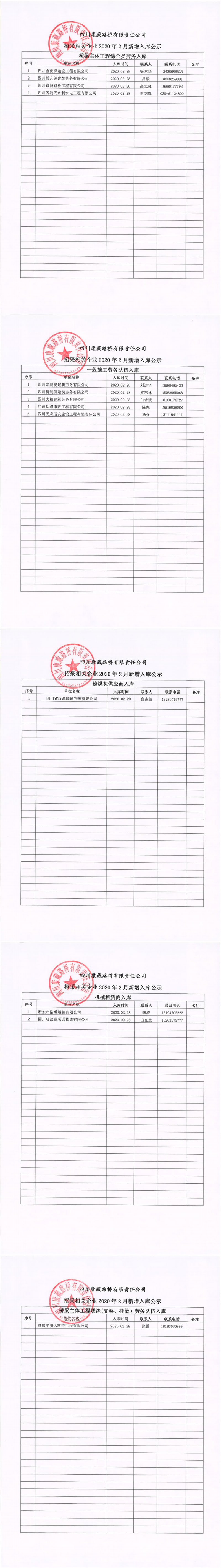 四川康藏路橋有限責任公司招采相關(guān)企業(yè)2020年2月新增入庫公示