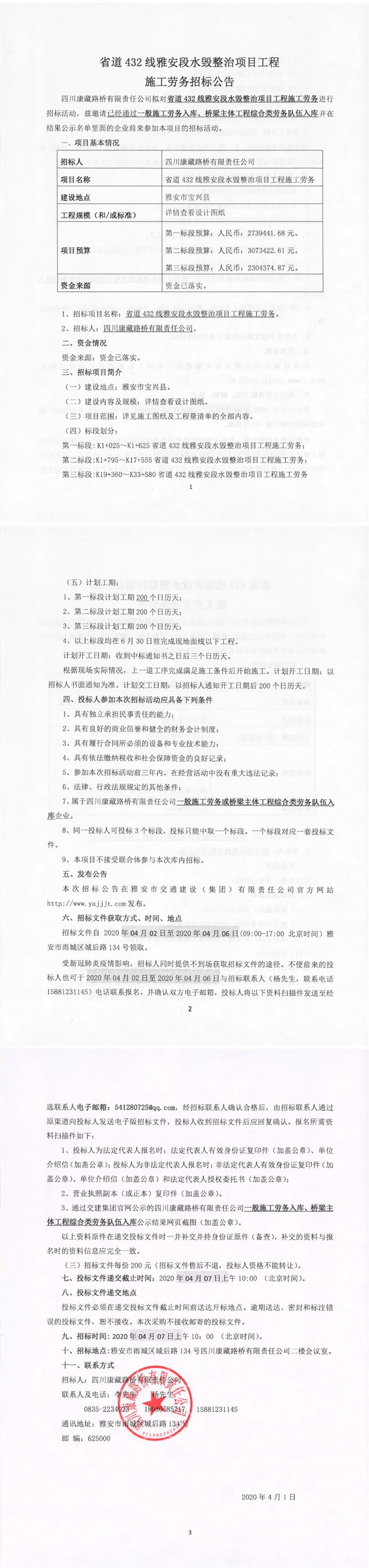四川康藏路橋有限責(zé)任公司省道432線雅安段水毀整治項目工程施工勞務(wù)招標(biāo)公告