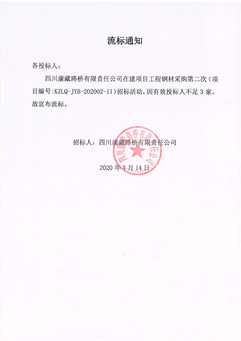 四川康藏路橋有限責任公司在建項目工程鋼材采購第二次流標通知