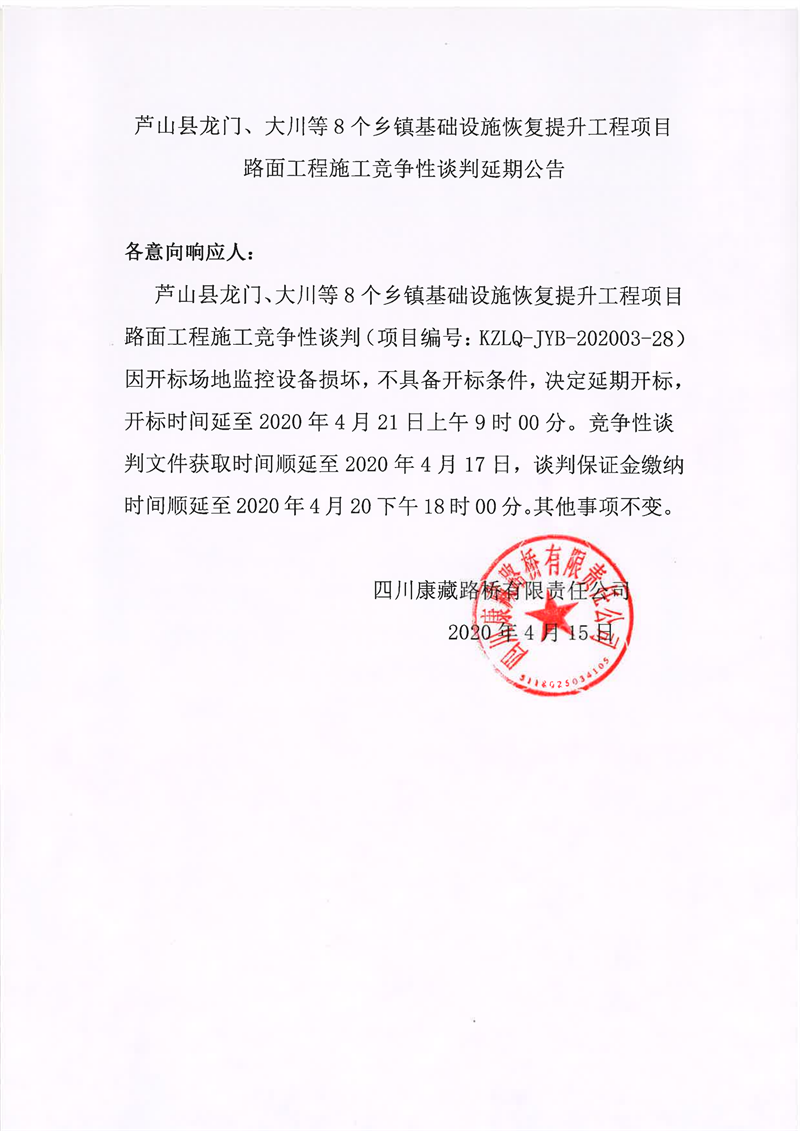 四川康藏路橋有限責(zé)任公司蘆山縣龍門、大川等8個(gè)鄉(xiāng)鎮(zhèn)基礎(chǔ)設(shè)施恢復(fù)提升工程項(xiàng)目路面工程施工競(jìng)爭性談判延期公告