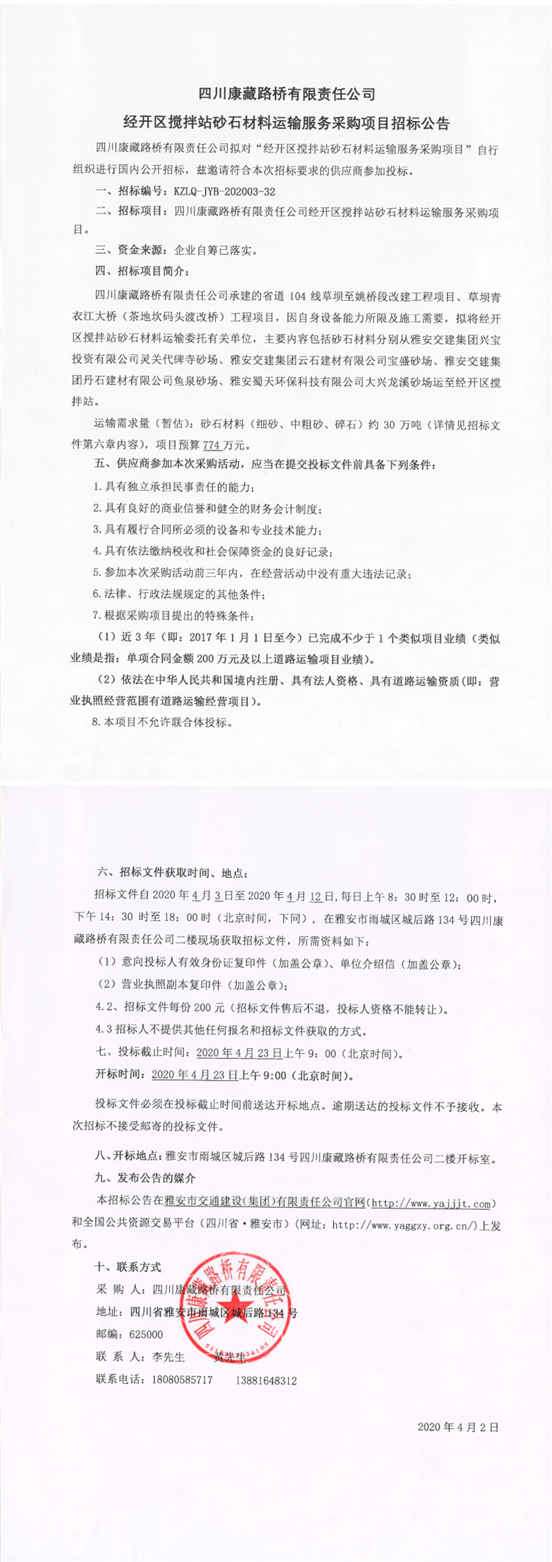 四川康藏路橋有限責任公司經開區(qū)攪拌站砂石材料運輸服務采購項目招標公告