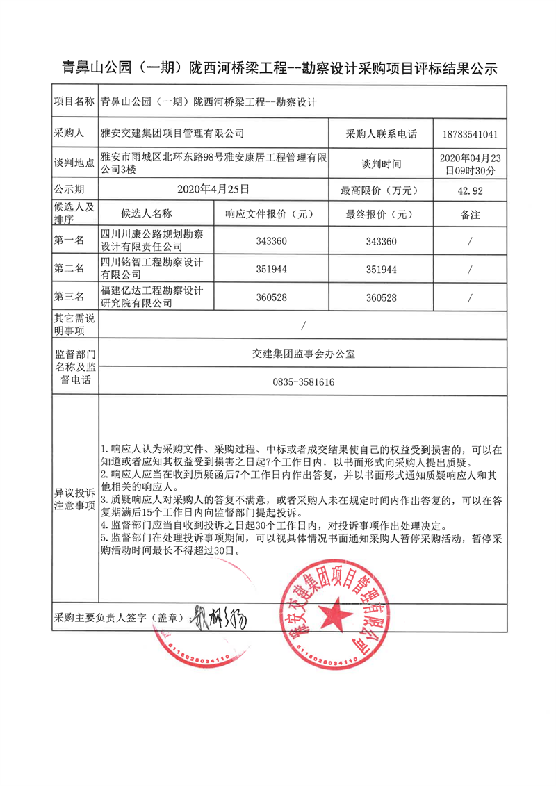 雅安交建集團(tuán)項(xiàng)目管理有限公司青鼻山公園(一期)隴西河橋梁工程項(xiàng)目勘察設(shè)計(jì)采購項(xiàng)目評標(biāo)結(jié)果公示