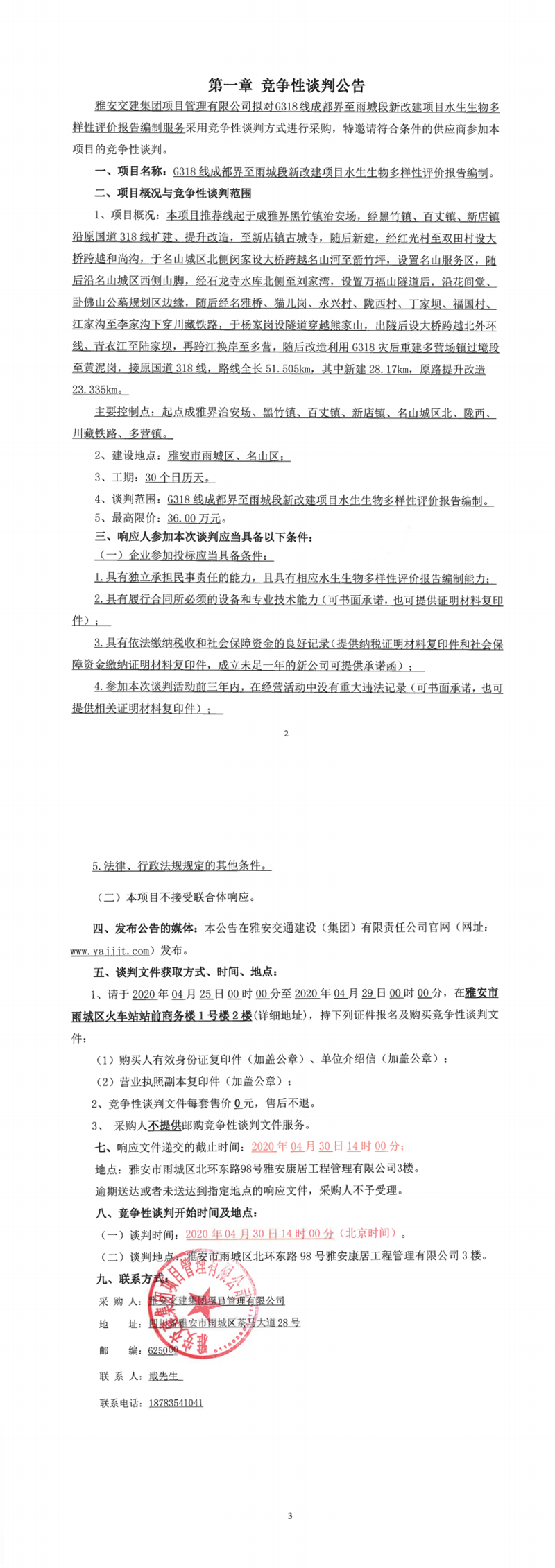雅安交建集團(tuán)項目管理有限公司G318線成都界至雨城段新改建項目水生生物多樣性影響評價編制競爭性談判公告