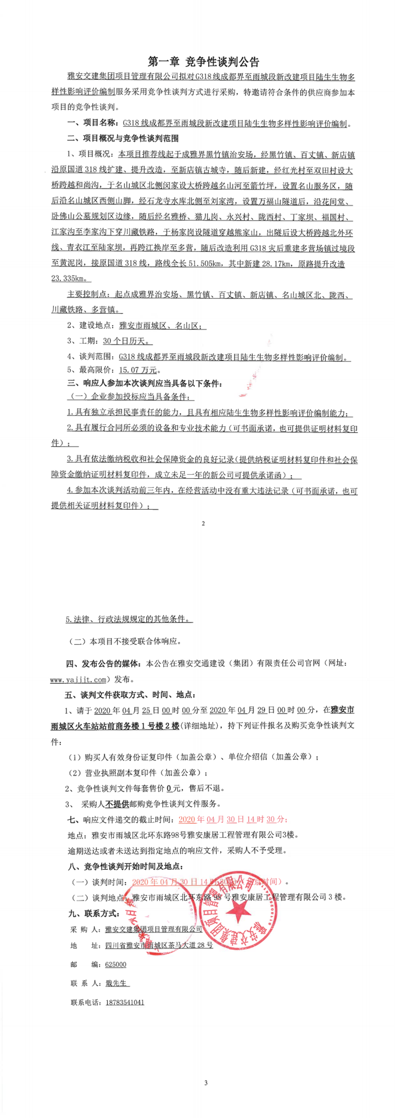 雅安交建集團(tuán)項(xiàng)目管理有限公司G318線成都界至雨城段新改建項(xiàng)目陸生生物多樣性影響評(píng)價(jià)編制競爭性談判公告