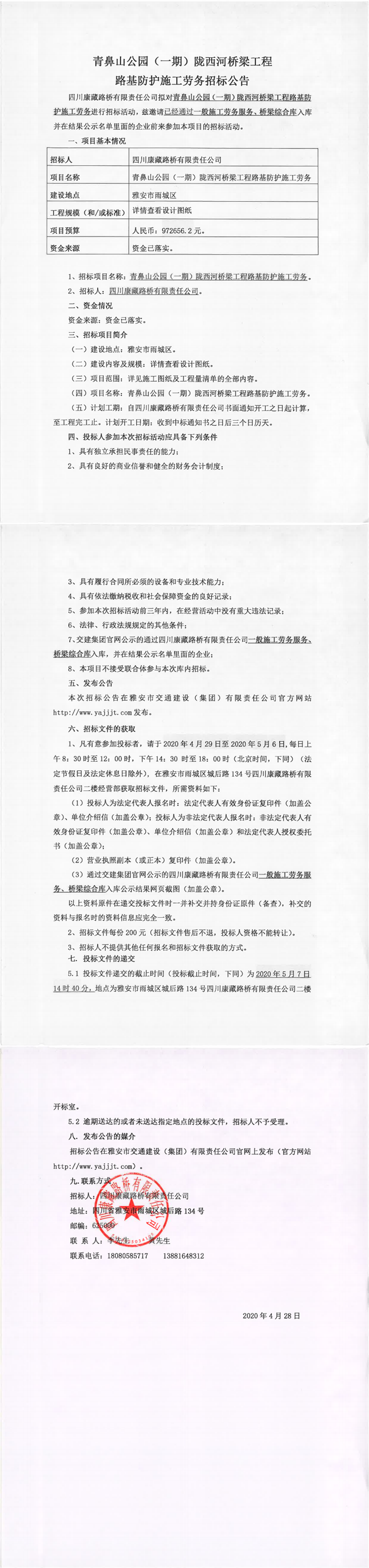 四川康藏路橋有限責任公司青鼻山公園(一期)隴西河橋梁工程路基防護施工勞務(wù)招標公告