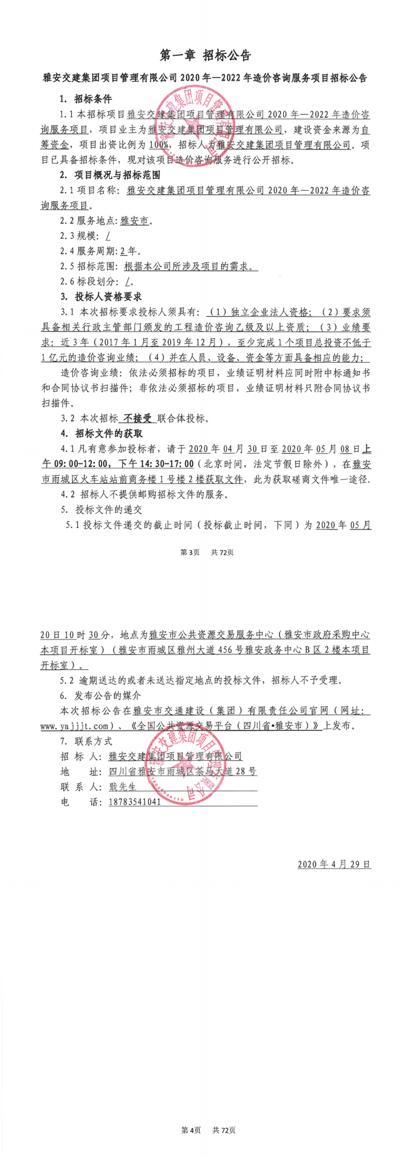 雅安交建集團項目管理有限公司2020年-2022年造價咨詢服務項目招標公告