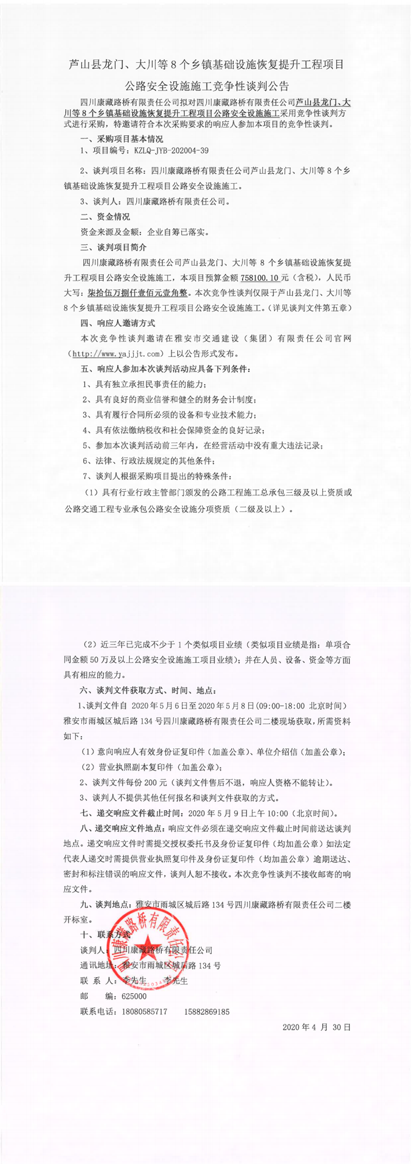 四川康藏路橋有限責(zé)任公司蘆山縣龍門、大川等8個鄉(xiāng)鎮(zhèn)基礎(chǔ)設(shè)施恢復(fù)提升工程項目公路安全設(shè)施施工競爭性談判公告